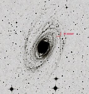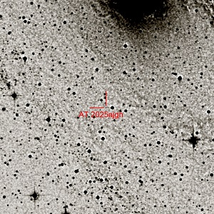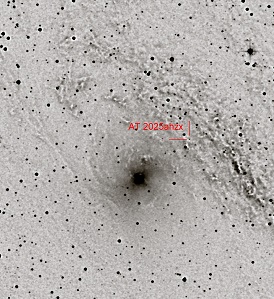 2025 ATel #17351 22 Aug 2025; 16:24 UT Comet C/2025 K1 (ATLAS) is deeply depleted of C2 Federico Manzini (Stazione Astronomica di Sozzago), Alessandra Mura (Padova University, INAF-OAPd), Andrea Reguitti (INAF-OAPd), Paolo Ochner (Padova University, INAF-OAPd), Virginio Oldani (Stazione Astronomica di Sozzago), Luigi R. Bedin (INAF-OAPd), Rachele Ottaviani (Padova University), Vittorio Andreoli (Osservatorio Astronomico Monte Baldo) TNS Astronomical Transient Report No. 257050 Date Received (UTC): 2025-05-28 09:15:28 Flavio Castellani report/s the discovery of a new astronomical transient. IAU Designation: AT 2025mho Discoverer internal name: OMB-PNV27 Coordinates (J2000): RA = 00:43:55.890 (10.982875) DEC = +41:34:50.50 (41.580694) Discovery date: 2025-05-28 02:06:35.000 (JD=2460823.5879051) Potential host galaxy: M31 Remarks: Flavio Castellani report the discovery by F.Castellani, R.Belligoli and V.Andreoli of a PNV (Mag. 18.5R +-0.20 - USNOB1 catalogue) in the host galaxy M31 at Monte Baldo Observatory, Ferrara di Monte Baldo, Verona, Italy (A99), in the course of Italian Supernovae Search Project using a 0.40m f/7 Dall-Kirkham telescope (+ Moravian G4-9000 KAF unfiltered CCD camera)9*180 co-added images. No stellar source was visible at the position of the transient in our past images including reference image dated 2025/03/08.7874 TCP J19065629+4019093 Ochner P., Andreoli V., and Balcon C. report the spectroscopic classification of TCP J19065629+4019093. A low-resolution spectrum was obtained with the 1.22-m telescope and B&C spectrograph (dispersion 2.25 Å/pixel) located in Asiago (Italy) on 2025-05-1.048 UT. The spectrum shows a blue continuum with Balmer lines: Hα (6562.8 Å) is in emission, filled-up by the accretion disk; Hβ (4860 Å) and Hγ (4340 Å) appear in absorption with weak central emission components, likely also originating from the disk. The other Balmer lines are present in absorption. The spectrum also shows weak helium features: He I 6678 Å in emission and He I 4472 Å in absorption. These characteristics are consistent with a cataclysmic variable (CV). We propose that TCP J19065629+4019093 is a CV. TCP J13560585+3727068 Farina.A, Andreoli.V, Ochner.P , Reguitti.A, Balcon.C report the classification of TCP J13560585+3727068. A low resolution spectrum was obtained with the 1.22-m telescope and B&C spectrograph (dispersion: 2.25 Å/pixel) located at the Asiago Observatory (Italy) on 2025-04-27.816 UT. The spectrum shows a blue continuum with Balmer absorption lines, except for Hα (6562.8 Å), which appears filled-up due to emission from the accretion disk. The Hβ (4861 Å) line exhibits a FWHM of ≈1700 km/s. A likely progenitor is identified as DR31495451060634509696 in the GAIA DR3 database (Gaia collaboration et al. 2023) with a g-mag of 17.825 implying a brightness increase of approximately 3 magnitudes (Δmag ≈ 3.5). These features are characteristic of a cataclysmic variable (CV). We propose to classify TCP J13560585+3727068 as a CV. AT2025img Andreoli.V, Balcon.C, Farina.A , Ochner.P , Reguitti.A A low resolution spectrum was obtained with the 1.22-m telescope and B&C spectrograph (dispersion: 2.25 Å/pixel) located at the Asiago Observatory (Italy) on 2025-04-27.831 UT. The spectrum shows a blue continuum with Balmer absorption lines, except for Hα (6562.8 Å) which has a weak emission caused by the accretion disk. The Hβ (4861 Å) line exhibits a FWHM of ≈2000 km/s. A likely progenitor is identified as DR3 3816231274612268544 in the GAIA DR3 database (Gaia collaboration et al. 2023) with a g-mag of 20.428 implying a brightness increase of approximately 5 magnitudes (Δmag ≈ 5.2). These features are characteristic of a cataclysmic variable (CV). We propose to classify 2025img as a CV. AT2025hwl Ochner P., Ferrigno F., and Andreoli V. reports the spectroscopic classification of AT2025hwl (TCP J18225593+1020013). A low resolution spectrum was obtained with the 1.22-m telescope and B&C spectrograph (dispersion: 2.25 Å/pixel) at Asiago Observatory (Italy) on 2025-04-22.027. The spectrum shows a blue continuum with Balmer absorption lines, except for Hα (6562.8 Å), which appears filled-up due to emission from the accretion disk. The Hβ (4861 Å) line exhibits a full width at half maximum (FWHM) of 1230 km/s. A likely progenitor is identified in ZTF data (Bellm et al. 2019) with a mean r-band magnitude of 18, implying a brightness increase of approximately 3 magnitudes (Δmag ≈ 3). These features are characteristic of a cataclysmic variable (CV). We propose that AT2025hwl be classified as a CV. TNS Astronomical Transient Report No. 246809 Date Received (UTC): 2025-03-05 22:24:06 Flavio Castellani report/s the discovery of a new astronomical transient. IAU Designation: AT 2025dkp Discoverer internal name: OMB-PNV24 Coordinates (J2000): RA = 09:55:12.610 (148.802542) DEC = +69:02:46.20 (69.046167) Discovery date: 2025-03-05 21:04:59.000 (JD=2460740.3784606) Potential host galaxy: M81 Remarks: Flavio Castellani report the discovery by F.Castellani, V.Andreoli, R.Belligoli of a PNV on a co-added 24*180 images (Mag.18.8R +-0.2 - USNOB1 catalogue) in the host galaxy M81 at Monte Baldo Observatory, Ferrara di Monte Baldo, Verona, Italy (A99), in the course of Italian Supernovae Search Project using a 0.40m f/7 Dall-Kirkham telescope (+ Moravian G4-9000 KAF CCD unfiltered CCD camera). No stellar source is visible at the position of the transient in our past images including reference image dated 2025/03/04.84208 ( AT 2025dkp) TNS Astronomical Transient Report No. 246714 Date Received (UTC): 2025-03-04 22:54:16 Flavio Castellani report/s the discovery of a new astronomical transient. IAU Designation: AT 2025dih Coordinates (J2000): RA = 09:55:43.430 (148.930958) DEC = +69:05:15.40 (69.087611) Discovery date: 2025-03-04 20:50:43.000 (JD=2460739.3685532) Potential host galaxy: M81 Remarks: Flavio Castellani report the discovery by F.Castellani, V.Andreo