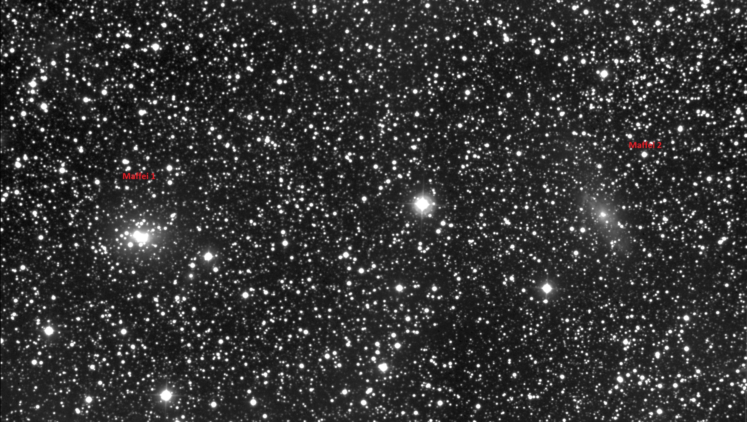 Nel 1968 Paolo Maffei stava lavorando da Asiago utilizzando la Schmidt 90/65, recentemente installata all’osservatorio. L’astronomo, pioniere italiano degli studi nell’infrarosso, esponeva lastre Kodak sensibili nel Blu e nell’infrarosso. Uno dei campi stellari indagati dall’astronomo era quello delle nebulose IC 1805 e IC 1848. Il 30 settembre, Maffei si accorse che in una delle lastre infrarosse esposte la notte precedente appariva un’oggetto nebuloso, completamente assente nel blu. Poco dopo ne scoprì a breve distanza un altro. Si dovette attendere il 1971 per comprendere che si trattava di due galassie. Immerse nel piano galattico, nascoste da coltri di polveri che estinguono oltre il 99% della loro luce, queste galassie appaiono nel visibile fra la sedicesima e la diciassettesima magnitudine. Ma se si trovassero fuori dalla “Zona d’ombra galattica” sarebbero tra le galassie più brillanti dell’emisfero nord. Maffei 1 è una galassia ellittica gigante; per l’esattezza è la gigante ellittica più vicina alla Via Lattea. La sua distanza è stimata di poco inferiore ai 10 milioni di AL (3 MPC). Maffei 2 è invece una spirale barrata ed è posta alla stessa distanza di Maffei 1, formando con questa un sistema binario simile a quello formato da Via Lattea e galassia di Andromeda. Le due galassie, assieme a IC 342, alle galassie Dwingewloo 1 e 2 ed ad un altro gruppetto di galassie nane formano il Gruppo di Maffei 1, confinante con il gruppo locale. La foto presentata è stata ottenuta con un collage di 2 campi ognuno esposto per 55 minuti senza filtri. Flavio Castellani |